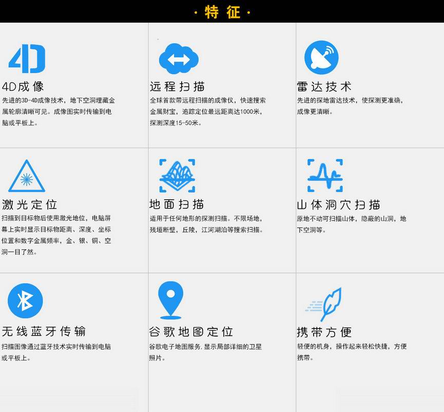 質(zhì)子遠(yuǎn)程4D成像探地雷達(dá)LB4四探頭版,實(shí)時(shí)掃描成像所有金屬寶藏,寶石,瓷器,空洞,實(shí)時(shí)掃描成像距離1000米,實(shí)時(shí)成像深度50米,區(qū)分各種物質(zhì)種類。