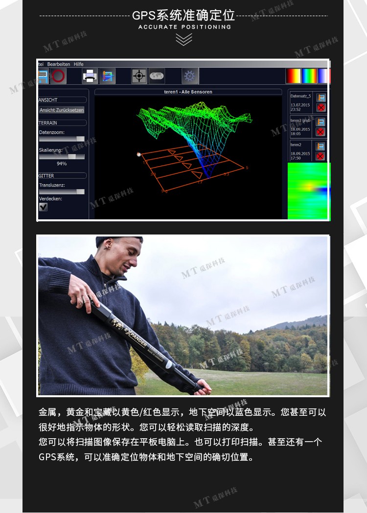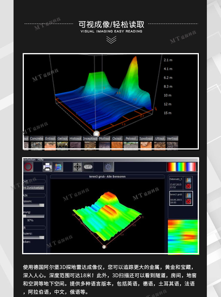 使用德國3D探地成像系統(tǒng),您可以追蹤大的金屬,黃金和寶藏。深度可達(dá)18米。此外,3D掃描還可以看到隧道,房間,地窖和地下空洞等。