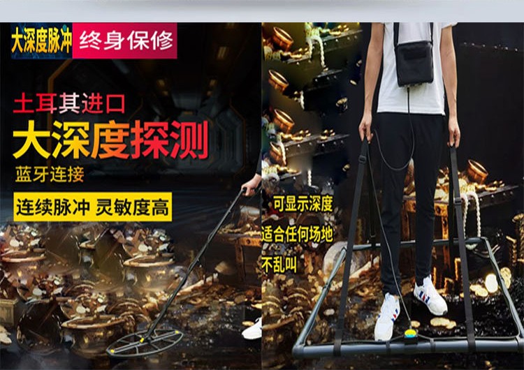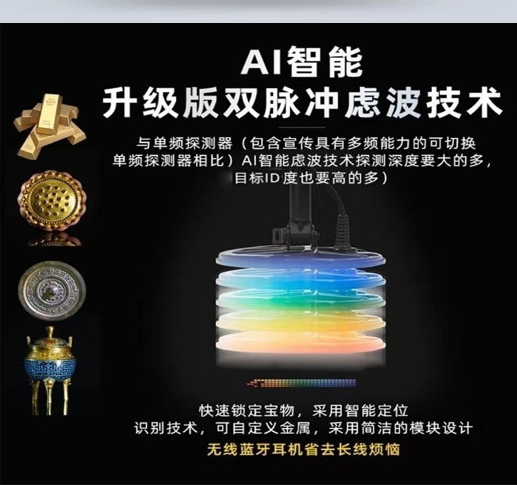 升級雙脈沖,智能化識別,一機(jī)五用,含四根探測線圈,手持探盤,加長型探棒,無線耳機(jī)等,可單框與立體框雙用!更加人性化,探測定位準(zhǔn)確!